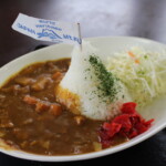 富士山の形をしたカレーライスを注文したのだが、おいしくてとてもかわいかった。食事の後、売店でハイキングポールを買った。これは、途中の山小屋で焼印を押してもらえるお土産のポールだ。